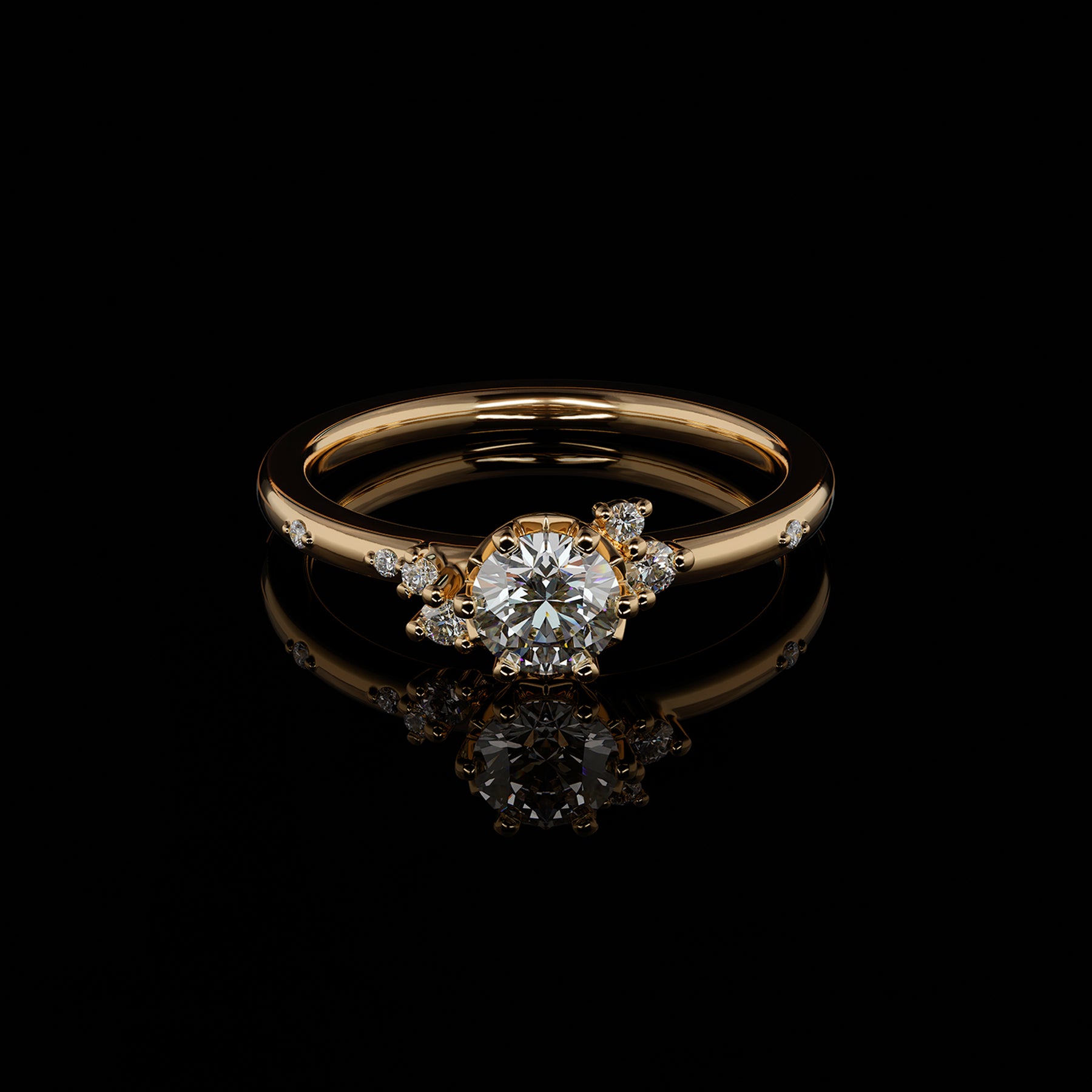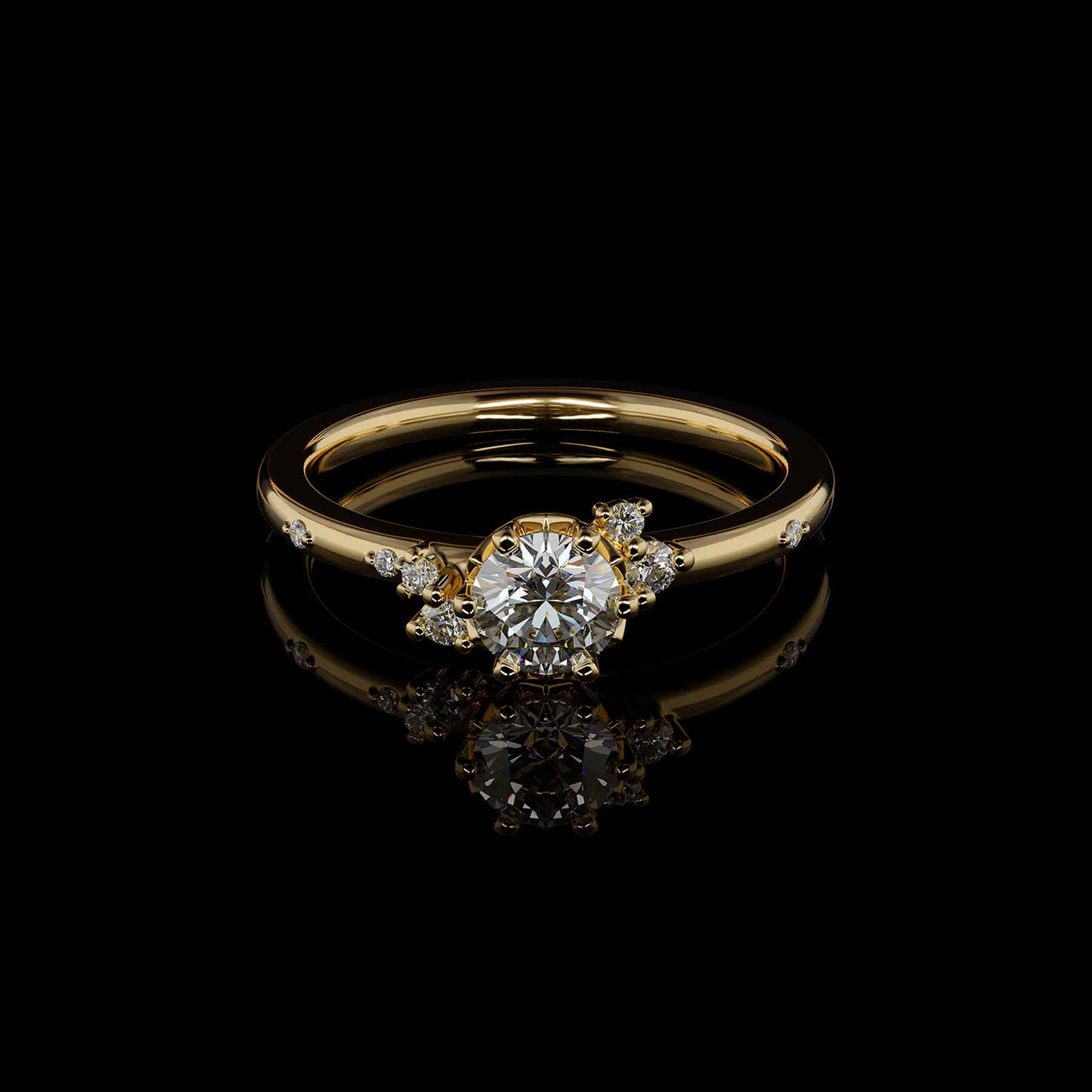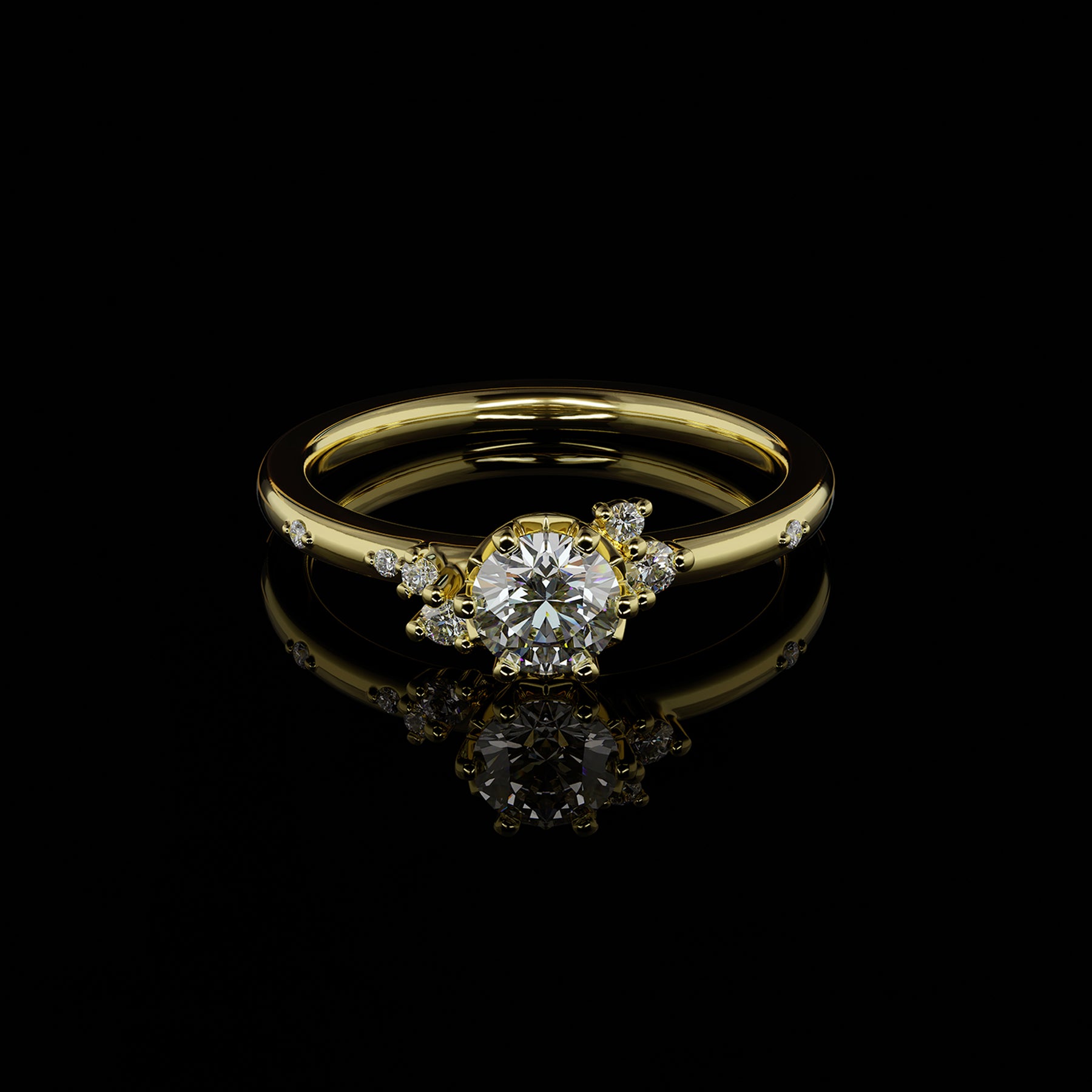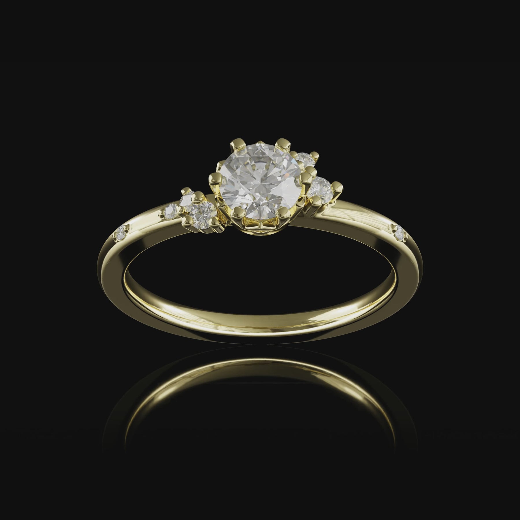 Steingrößen: Mittelstein 0.5 ct, Seitensteine 1 x 0.025 ct, 1 x 0.02 ct, 2 x 0.01 ct, 3 x 0.005 ct im Brillantschliff