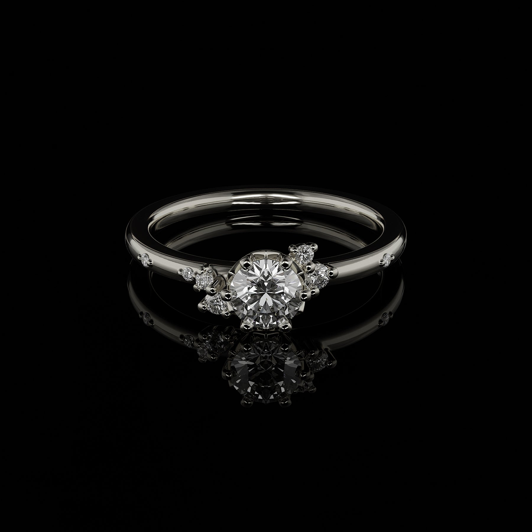Nora ist die große Schwester unseres Klassikers Nari. Die blumige Mittelsteinfassung wird kunstvoll von feinen, asymmetrisch angeordneten Diamanten begleitet, die den Brillant sanft umspielen und dem Design eine zarte, aber ausdrucksstarke Wirkung verleihen.