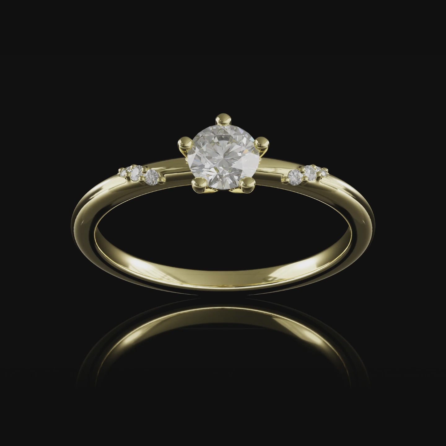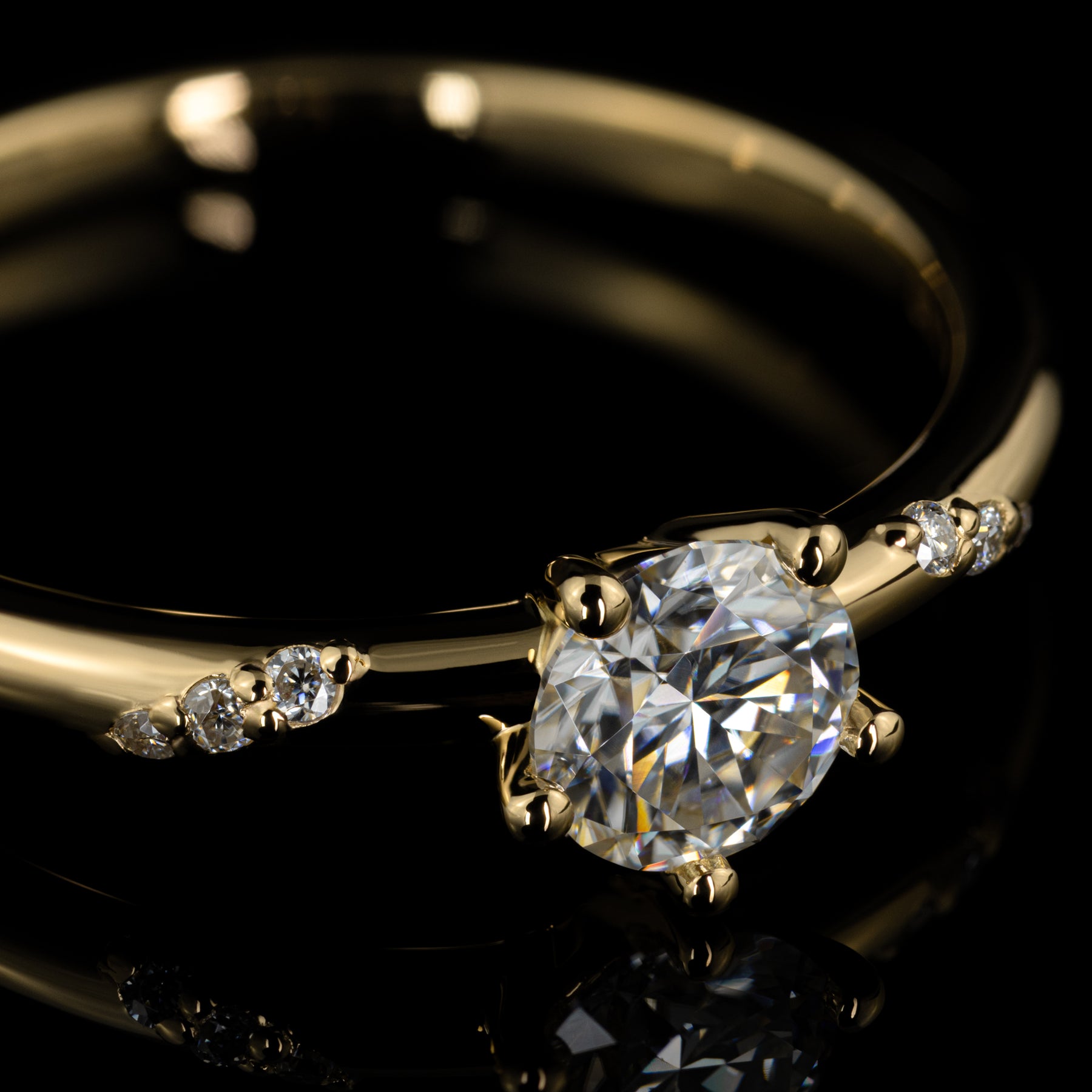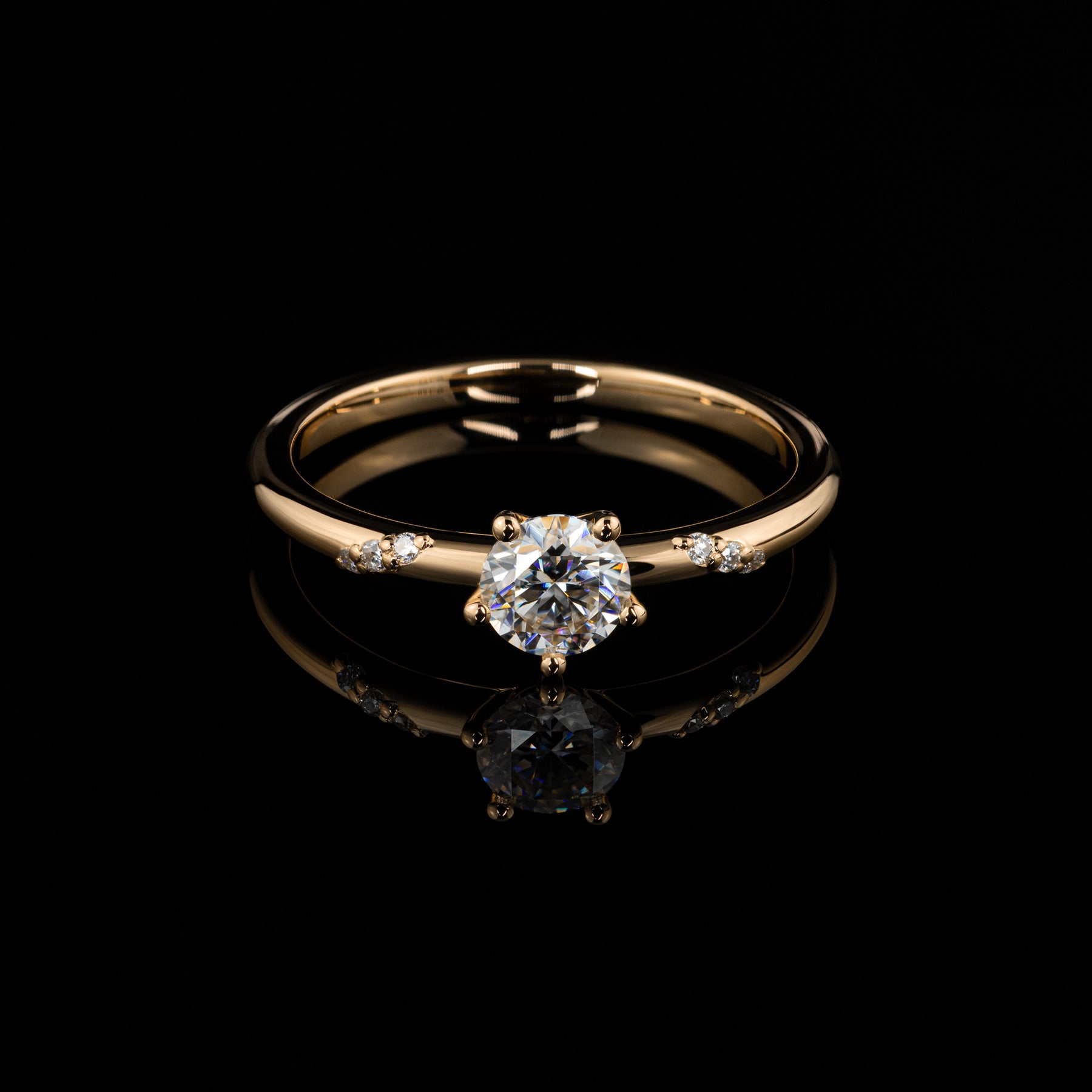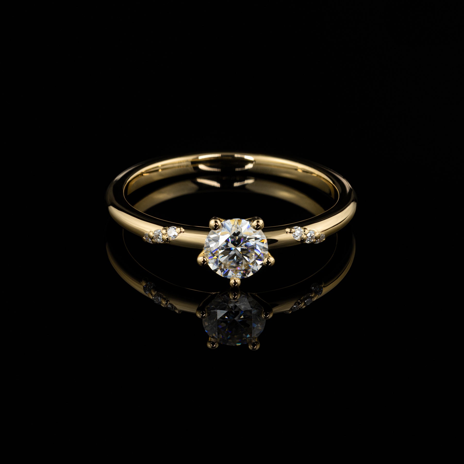 Unser Verlobungsring Vanja ist ein bezaubernder Solitaire, den man im Idealfall solo am Finger trägt. Ungewöhnlich, aber ein echter Hingucker, ist die asymmetrische Wirkung des Rings durch die ungerade Anzahl von 5 Krappen an der Mittelsteinfassung! Die 6 kleinen Seitensteine unterstreichen das asymmetrische Design, sie umschlingen den runden Ring und leiten den Blick optimal auf den 0.35ct Brillant in der Mitte.