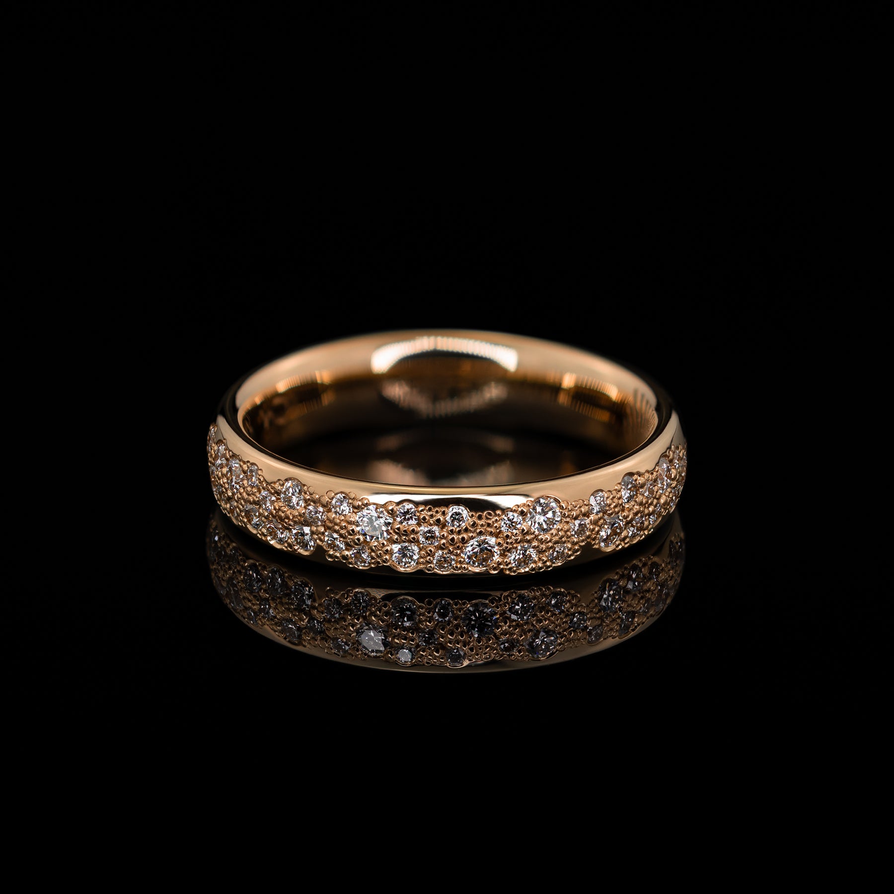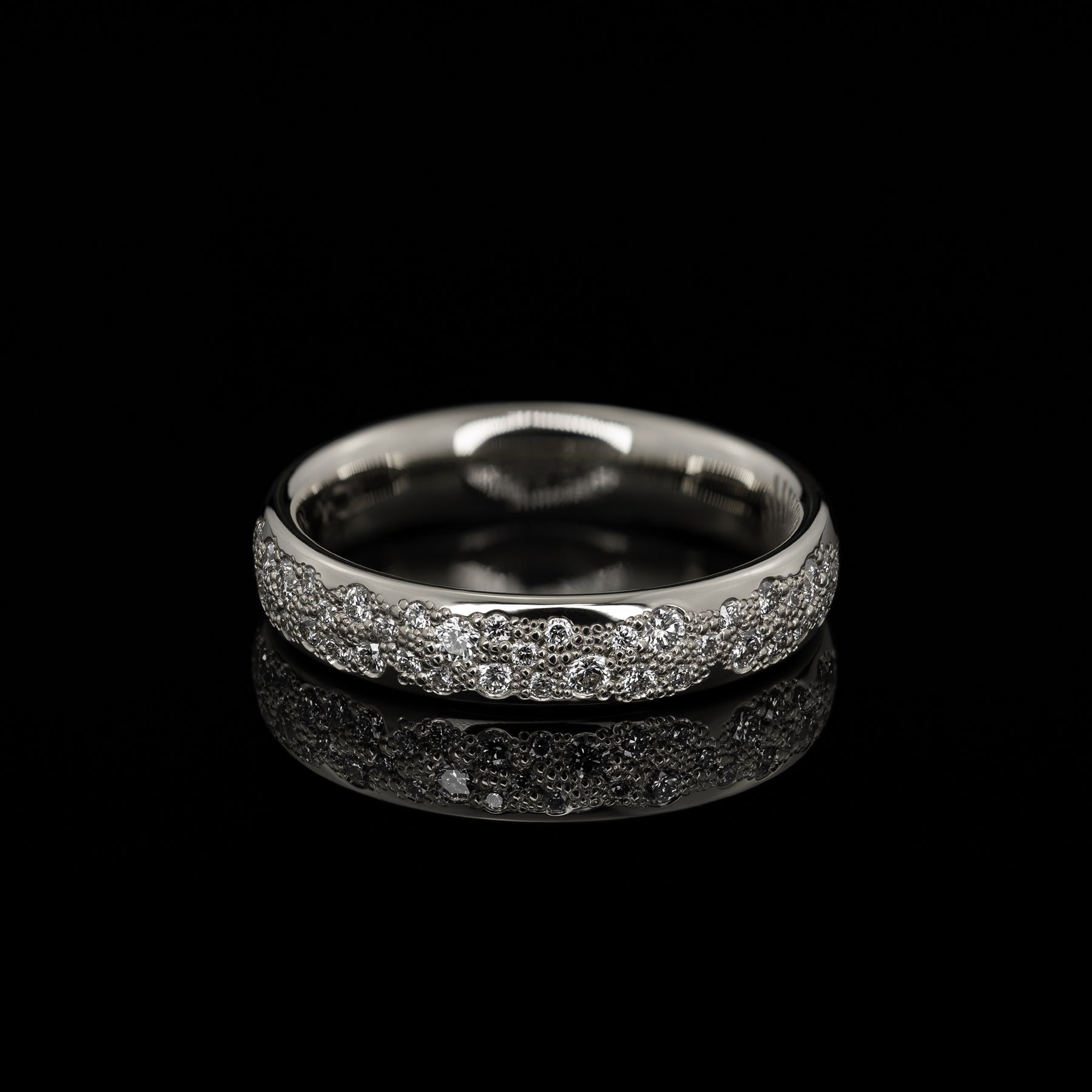 Mit satten 0.5 ct ist die Oberfläche von Mia von einer großflächigen Wolke aus Edelsteinen besetzt und glitzert fantastisch. Der Steinbesatz reicht je nach Ringgröße etwa um zwei Drittel des Eherings.